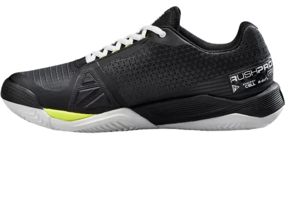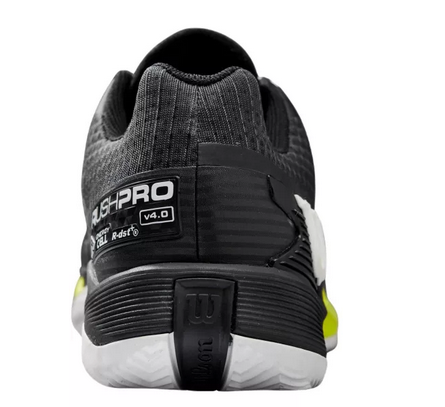 Tenisová obuv Wilson Rush Pro 4.0 Clay kombinuje ohromující styl s ohromujícím výkonem. 4D Support Chassis 2.0 evoluce konstrukce podrážky Rush Pro 3.5, která je rozdělenana dva díly pro dvojí účel: jeden díl se nachází pod chodidlem pro lepší podporu a pohyb vpřed, zatímco druhý je určený pro větší stabilitu a kontrolu. V přední části mezipodešve obsahuje Energy Cell lehkou pěnu EVA která je navržena tak, aby optimalizovala přenos tělesné hmotnosti při nárazu pro výbušnější pohyn. Další technologie Energy Surge obsahuje lehkou pěnu EVA v přední části mezipodešve, která vytváří měkký pocit a optimální přenos tělesné hmotnosti pro výbušné zrychlení. Sensifeel 2.0 má minimálně vrstvený svršek s navrženou síťovinou pro lepší prodyšnost, pocit a pohodlí. Endofit poskytuje zvýšený komfort, stabilitu a intuitivní přizpůsobení díky kompletní vnitřní konstrukci ponožky. DF2 poskytuje tlumený pocit na kurtu a přináší kompromis mezi pohodlím a rychlým výkonem (DF2 = HT Drop 9 mm). R-DST+ nabízí nejlepší kombinaci tlumení a odrazu pro dynamičtější výkon. Duralast se skládá z vysoce hutné, dokonale odolné pryžové směsi, která poskytuje odolnost proti oděru a maximální trakci na všech površích. Obuv disponuje speciální CLAY podrážkou pro antuku.