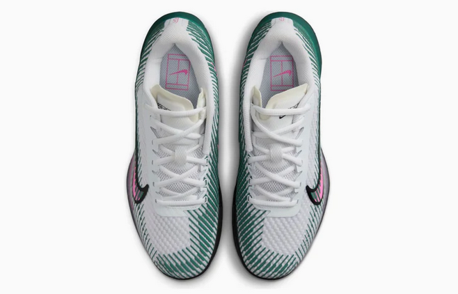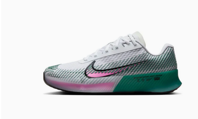 Model Vapor 11 odzkoušený velikány hry je zpátky a lepší než kdy dřív. Je blíž k zemi a plný rychlostních prvků, takže ti umožní hrát v rychlém tempu s dostatečnou oporou na skákání a běhání set za setem. Hlavní části, jako jsou mimořádně osvědčené tvarované boční díly a prodyšný svršek, skvěle ladí s odolným a rychlým designem, který si tak všichni zamilovali. Nízké provedení pro rychlejší hru. Vapor 11 má nižší provedení než předchozí verze. Bota je neuvěřitelně lehká, takže tě nijak neomezuje při výbušných rychlých pohybech ani při náhlých změnách směru. Snadné obouvání. Pohodlným polovičním vnitřním návlekem jsme zjednodušili nazouvání a zouvání. Jednotka Zoom Air v přední části boty pruží od prvního kroku a pomůže ti dostat se k vítěznému úderu u základní čáry nebo k síti rychle jako blesk. Tlumená mezipodešev zajišťuje oporu a nepřidává zbytečnou hmotnost navíc. Podrážka se stromečkovým vzorem je vytvořená na základě přesných dat, a má tak optimální přilnavost, ale zároveň ti nebrání ve skluzech.V méně namáhaných zónách jsme zase gumu ubrali, aby byla podrážka co nejlehčí.Odolná a zesílená síťovina pomáhá udržet nohy svěží a dodává jim extra oporu.Skelet po celé délce boty na vnější straně boty stabilizuje nohu při rychlých změnách směru. Bota je určená na kurty s tvrdým povrchem.