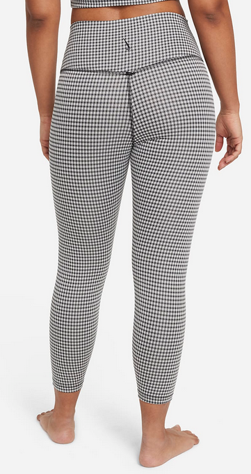 UPEVNI SVOU POZICI.Legíny Nike Yoga jsou vyrobené z texturovaného materiálu (alespoň ze 75 % recyklovaný polyester) a zdobí je vyletněný ginghamový vzorek. Měkký a pružný design se zvýšeným pasem tě pohodlně zakryje během hlubokých nádechů a ásan při tvém cvičení. Měkká, pružná tkanina s technologií Dri-FIT odvádí pot, příjemně se nosí a nebrání v pohybu. Minimalistické švy pomáhají dotvářet elegantní siluetu.Střih s vysokým pasem ti pohodlně schová záda, když se ohýbáš a protahuješ. Do vnitřní kapsy vpředu v pase si můžeš dát klíče nebo kartu.Texturovaný ginghamový vzorek vytváří klasický vyletněný vzhled a lehký tvar písmene V v zadní části zvýrazňuje tvé přirozené křivky. 90% POLYESTER 10% ELASTAN